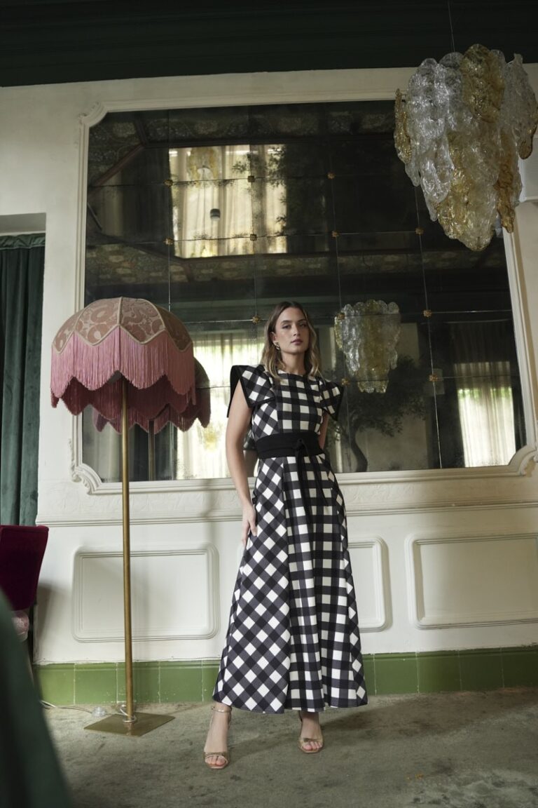 Calças de cintura subida com padrão xadrez em tons rosados, que combinam sofisticação e conforto.