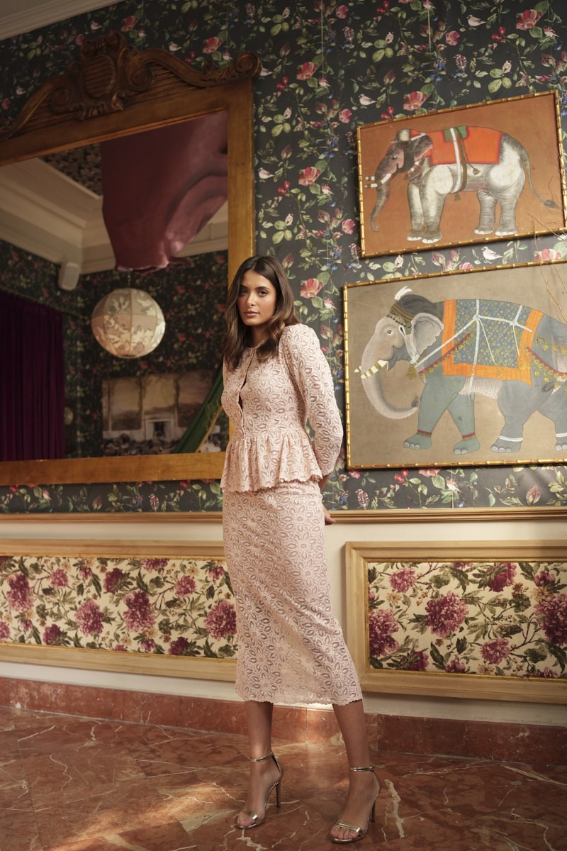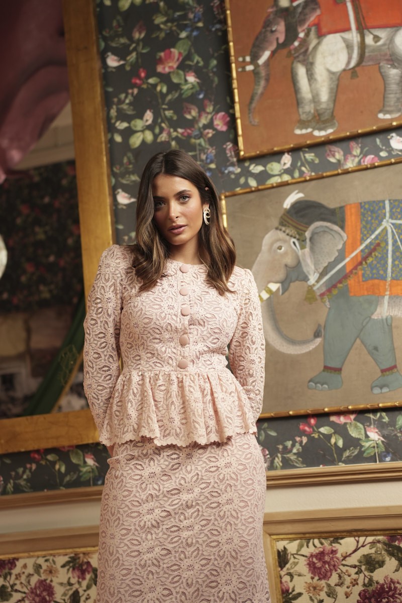 O top, com manga comprida e corte cintado, apresenta um delicado peplum na cintura que valoriza a silhueta e acrescenta um toque romântico. A renda trabalhada confere textura e requinte à peça, mantendo um visual leve e harmonioso.