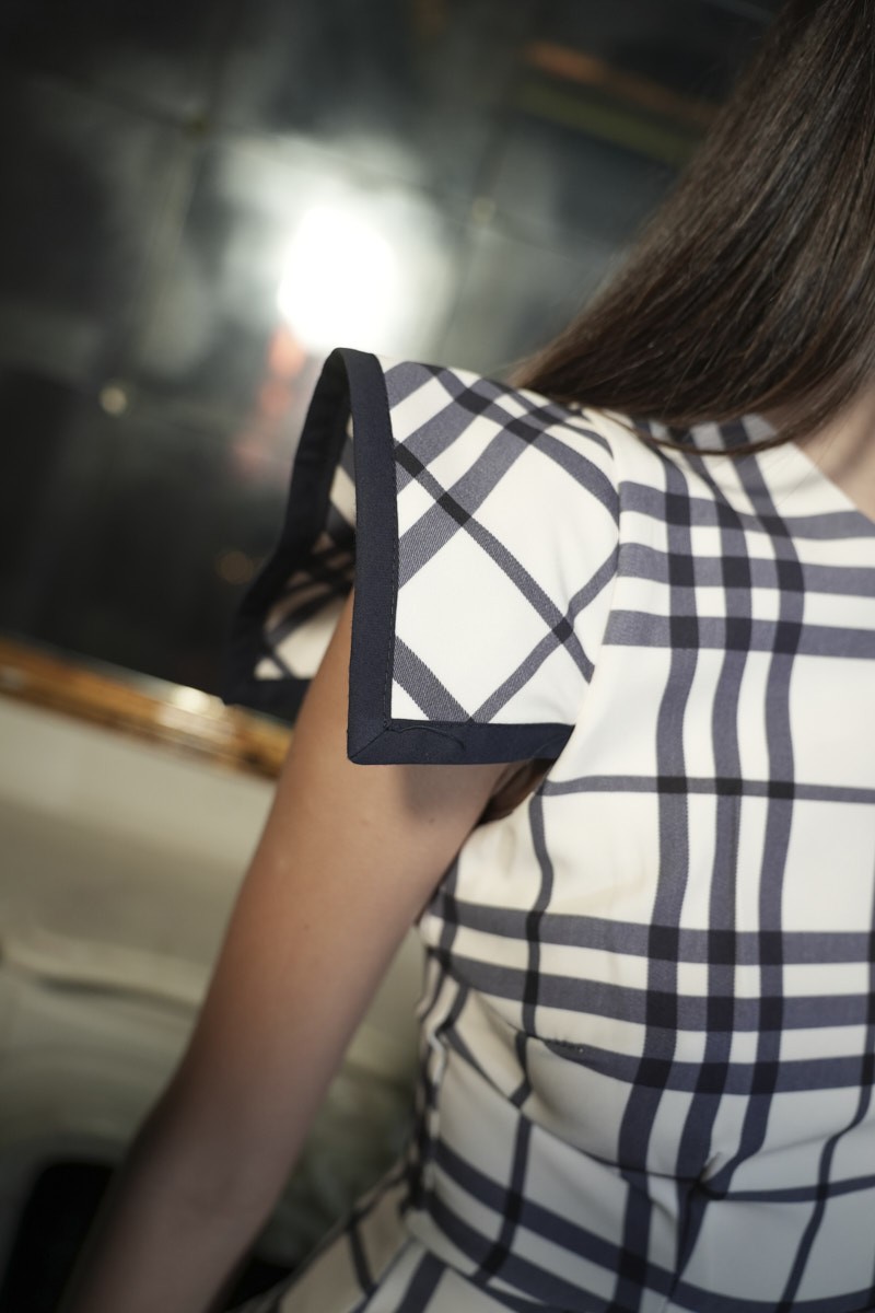 Conjunto de duas peças com padrão clássico aos quadrados, composto por top estruturado com detalhe peplum e calça de corte ajustado.
