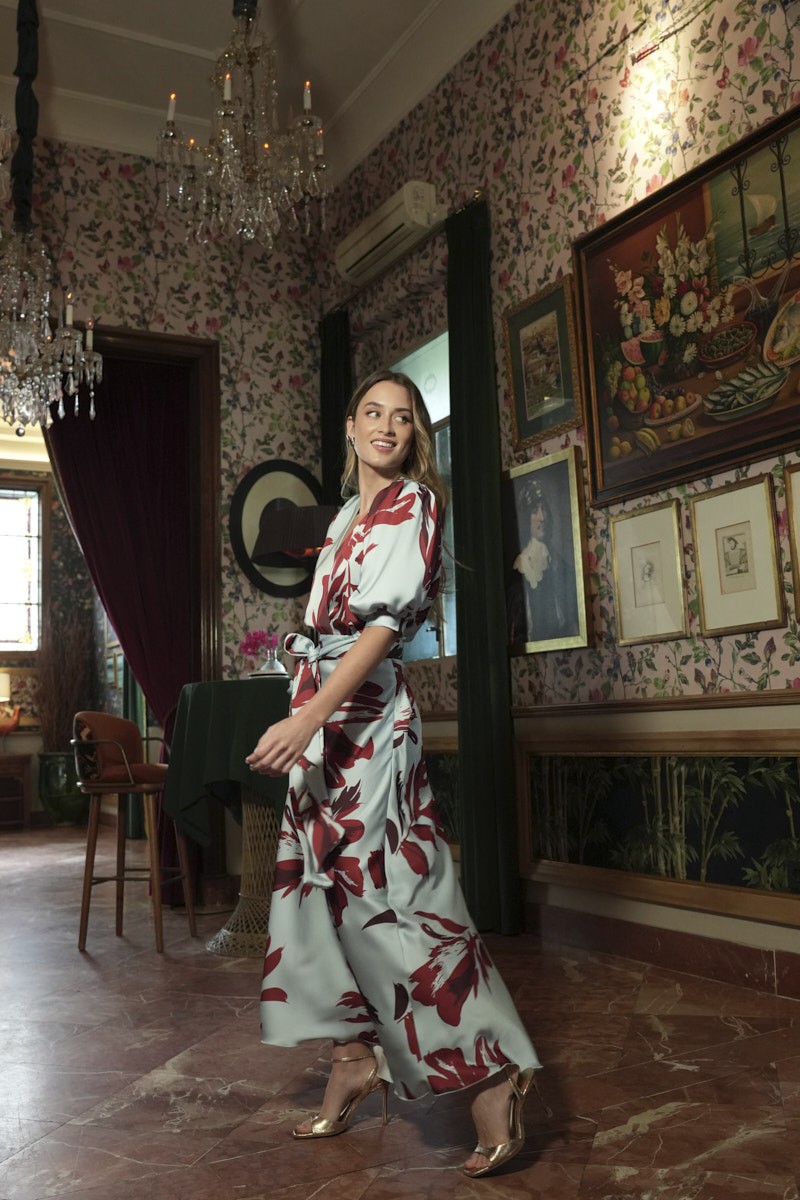O decote em V valoriza a silhueta, enquanto as mangas com volume acrescentam um toque moderno e refinado. A cintura ajustável com cinto do mesmo tecido permite um ajuste perfeito ao corpo, criando um caimento fluido e elegante.