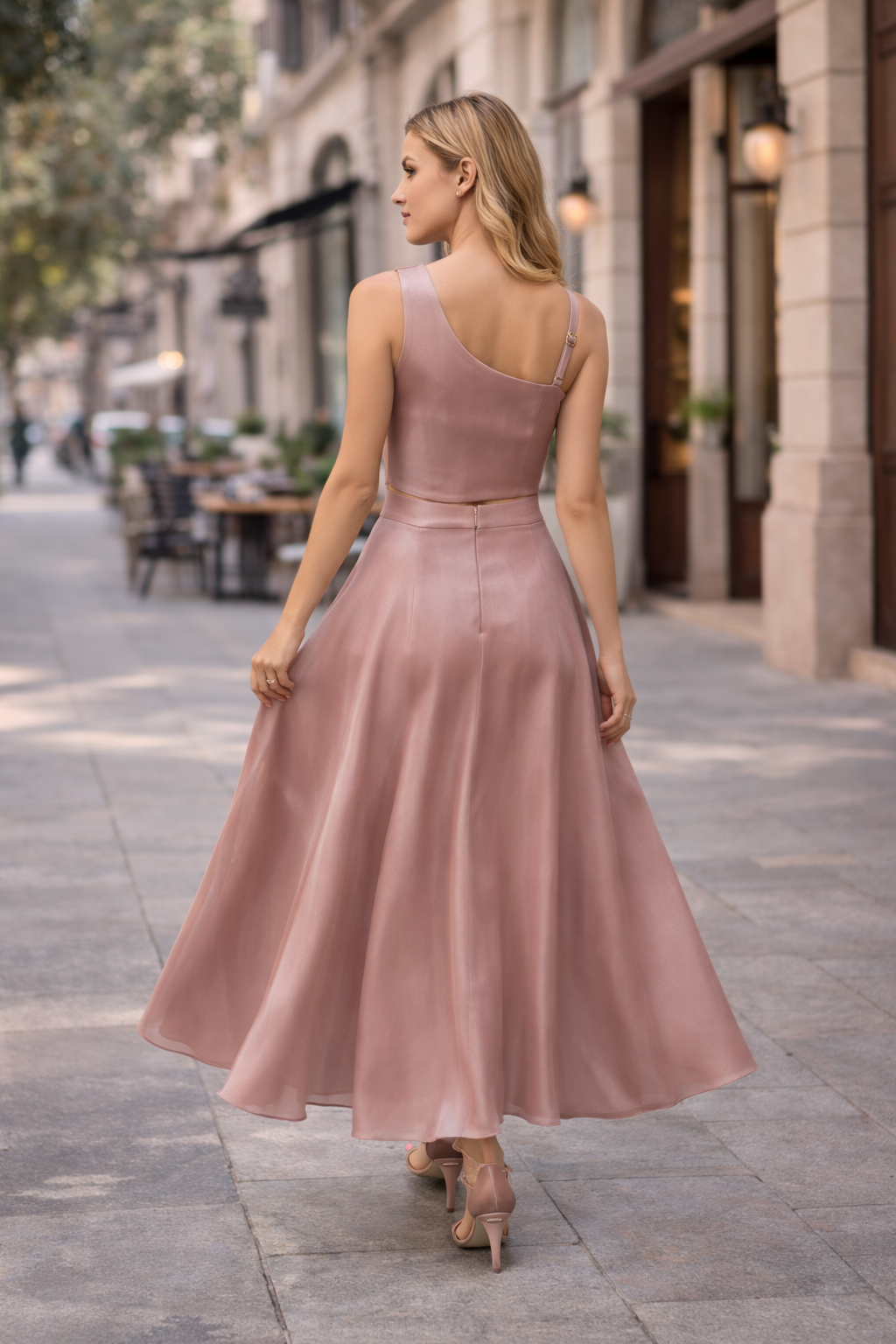 Com um top assimétrico com aplicação floral no ombro e uma saia midi fluida, este modelo destaca-se pela sua silhueta leve e extremamente feminina. O tecido acetinado confere um brilho suave e sofisticado, enquanto o corte da saia cria movimento natural ao caminhar.