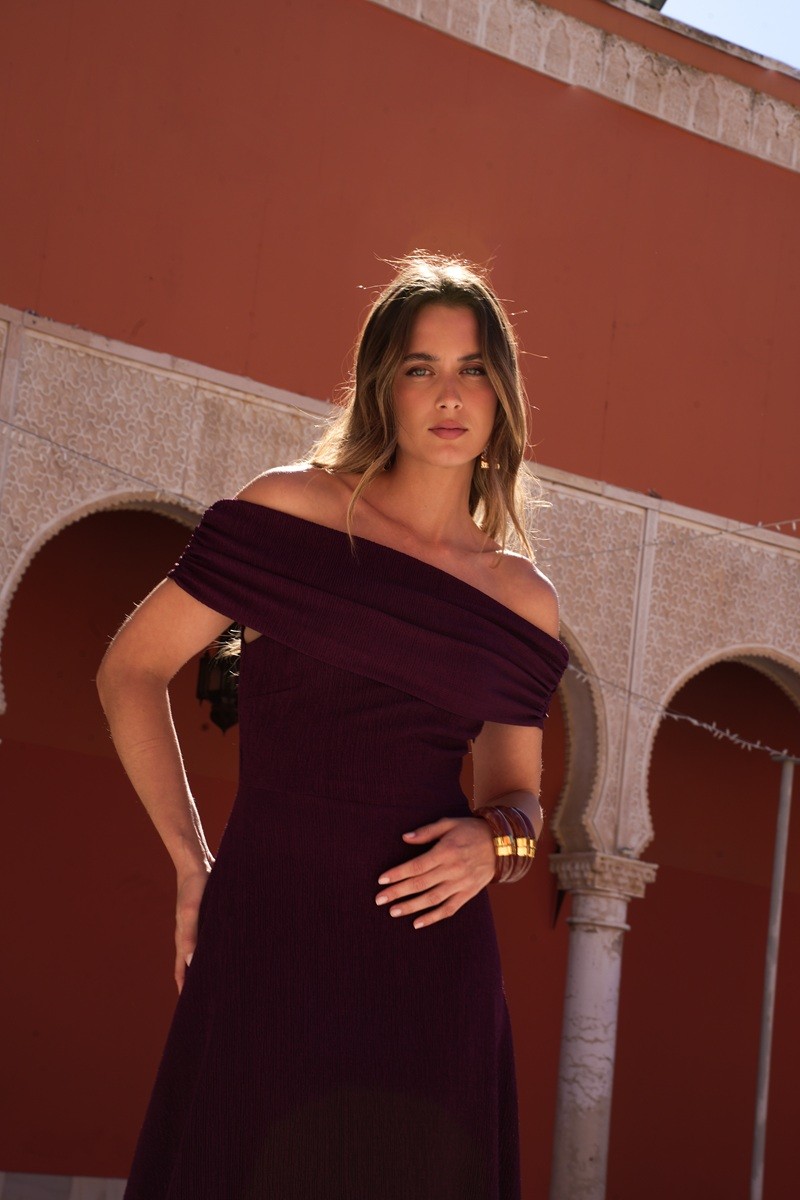 Na cor bordô, apresenta um decote estilo barco que valoriza suavemente a linha dos ombros, criando uma silhueta feminina e sofisticada.