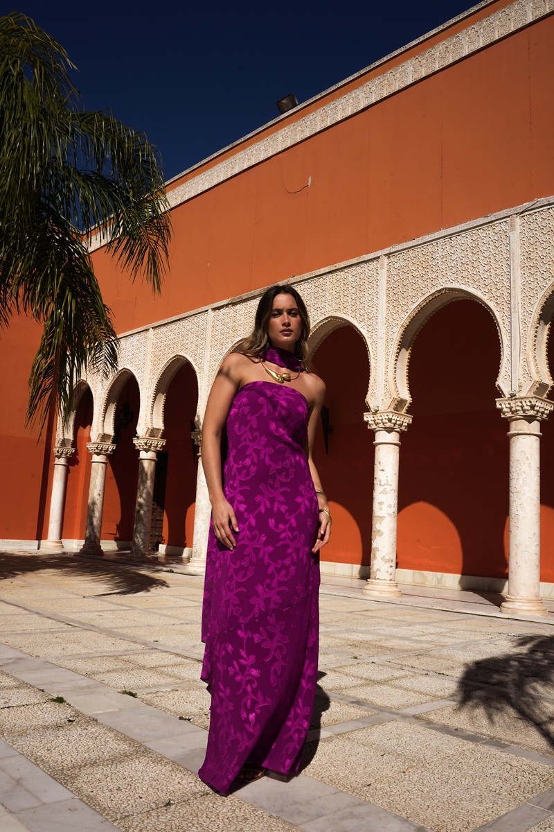 O vestido Jimena, em tom buganvília com padrão subtil, é uma peça elegante e marcante para casamentos e ocasiões especiais.